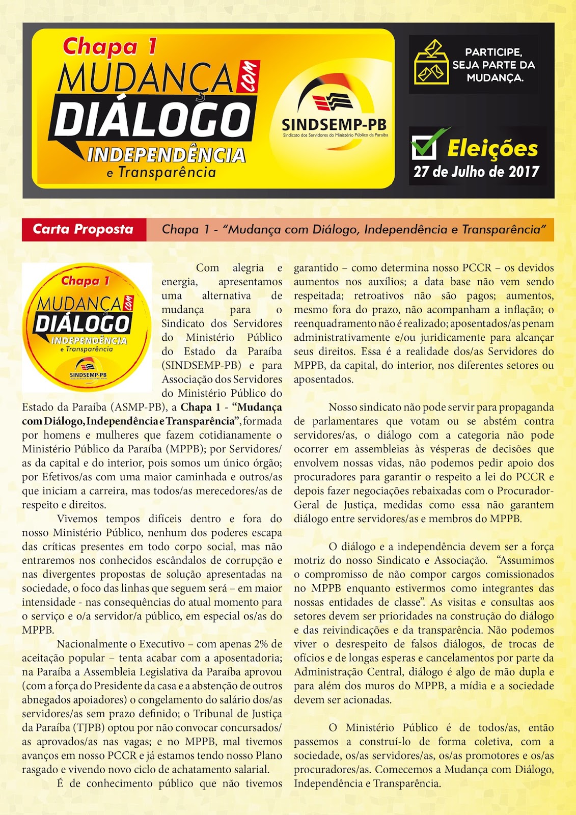 SINDSEMP-PB – Chapa 01 – “Mudança com Diálogo, Independência e Transparência”.