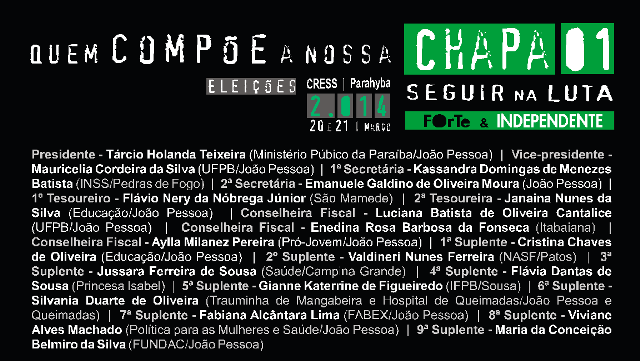 nComo é donconhecimento de tod@s, estou afastado do CRESS/PB para concorrer a reeleição aonlado de outr@s companheir@s que estiveram na atual gestão da entidade e outr@snque aderiram por reconhecer os rumos positivos dado ao nosso Conselho nanParaíba. a campanha começou hánpoucos dias e as adesões já passam das centenas, adesões essas que não senlimitam aos/as Assistentes Sociais, ampliam-se entre @s que lutam por umansociedade sem exploração de classe, raça, etnia ou gênero.