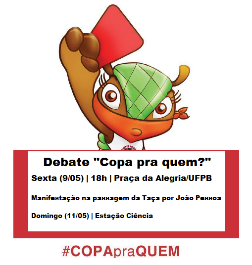 nEm meio a tantos protestos contra o derrame de dinheiro público para Copa da FIFA, em detrimento das políticas públicas, seria fundamental (no mínimo) a realização de uma consulta pública. Além de saber se anpopulação da Paraíba é favorável a realização desses dois eventos relacionados ànFIFA, é preciso que o Prefeito de João Pessoa e o Governador da Paraíbanrespondam algumas questões: