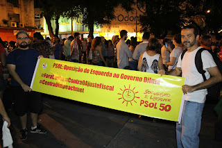 nOnPSOL e a Frente Povo Sem Medo esteve na construção dos atos nacionais -nrealizados no último dia 31 de março – contra o Golpe, contra o Ajuste fiscalndo Governo Dilma e Pelo Fora Cunha. Na Paraíba, infelizmente, a política hegemonistanda Frente Brasil Popular, composta inclusive pelo PSB que é favorável ao Golpe,ntem dificultado um maior envolvimento de outras formas de pensar, o que acaba deixandonde lado (ou dando menos intensidade) a pauta de enfrentamento ao Ajuste Fiscal,nfocando apenas na pauta política, como se fosse possível separar da economia,ndas reais necessidades do povo.