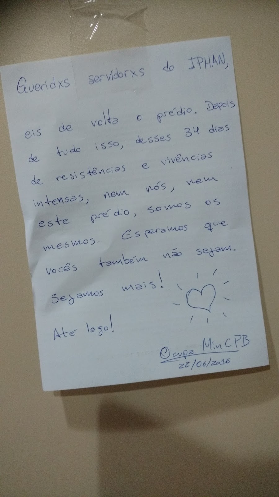 nNãonlembro de ter ficado tão emocionado em minha vida militante como fiquei no dian22 de junho de 2016, quando o #OcupaMINCPB deixava o prédio do IPHAN paranocupar as Praças e as Ruas. Nem mesmo nos grandes atos de 2013 fiquei tão emocionado,nfoi como se nos 34 dias de ocupação eu tivesse de fato conhecido e reconhecido minhas/meusncompanheir@s de 2013.