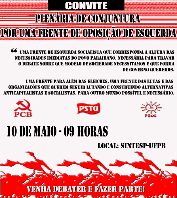 nFICA AQUI O CONVITE PARA QUE TOD@S VENHAMnPARTICIPAR DA PLENÁRIA DE CONJUNTURA POR UMA FRENTE DE OPOSIÇÃO DA ESQUERDAnSOCIALISTA, SERÁ NO DIA 10 DE MAIO (09h- SINTESP/UFPB).
