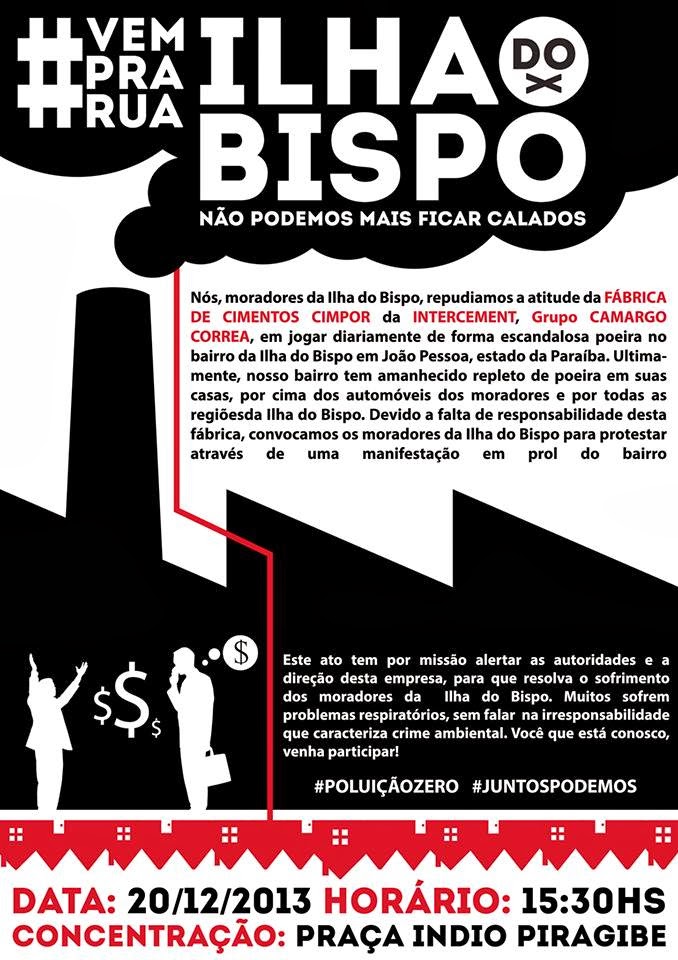 Nós, moradores da Ilha do Bispo, repudiamos a atitude da FÁBRICA DE CIMENTOS CIMPOR da INTERCEMENT, Grupo CAMARGO CORREA, em jogar diariamente de forma escandalosa poeira no bairro da Ilha do Bispo em João Pessoa, estado da Paraíba.
